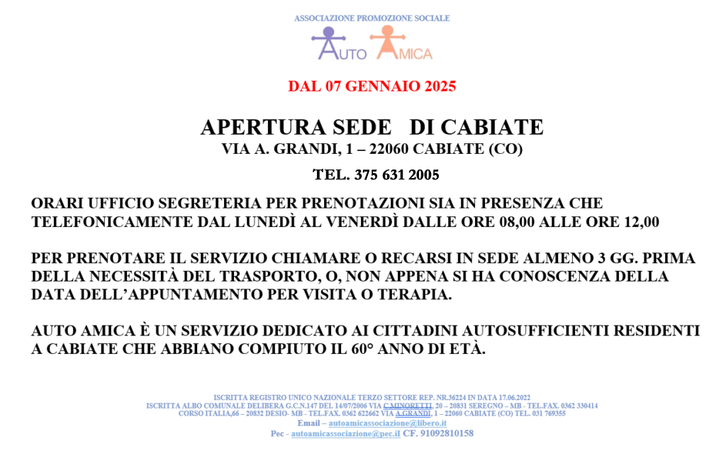 Per prenotare un nuovo servizio di accompagnamento, non appena hai conferma dalla struttura su data ed ora, telefonaci subito (dal lunedì al venerdì dalle 8.30 alle 12.30 e, solo per Seregno, dalle 13.30 alle 17.30) a questi numeri:
